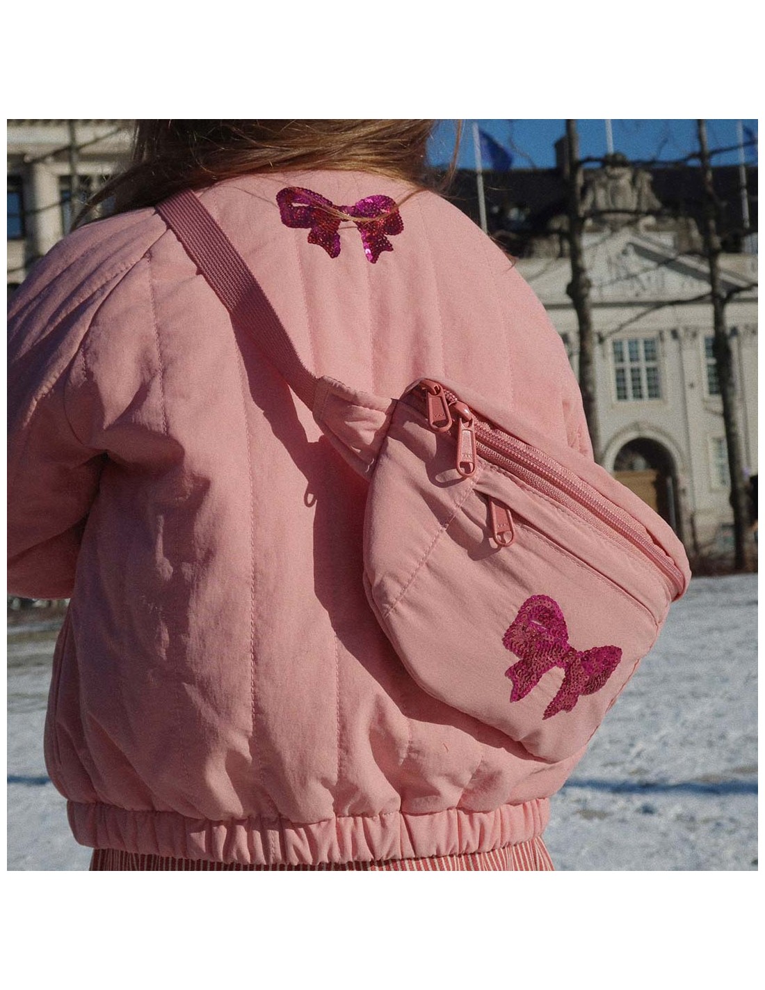 Permettez à votre enfant d'emporter son doudou et son goûter partout avec lui grâce au sac banane "Juno Rosette" de chez Konges Slojd. A la fois pratique et tendance, il est orné d'un nœud rose à sequin sur le devant.