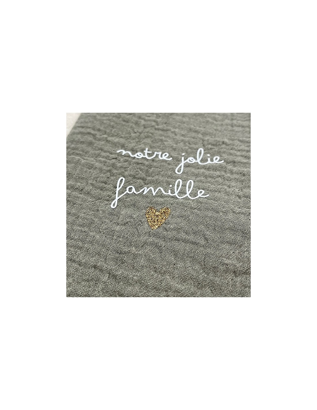 Protège Livret de Famille élégant et sobre, fabriqué en Gaze de Coton Verte - Inscription Notre Jolie Famille - Cœur Doré pailleté