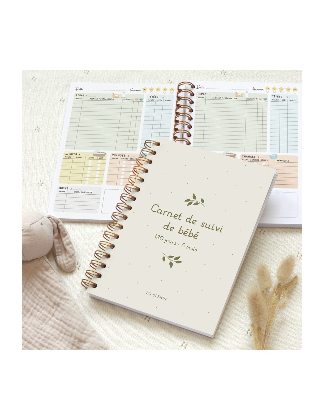 Une page quotidienne dédiée à l’organisation : repas, sommeil, changes, soins, bain + un espace pour vos remarques ou anecdotes