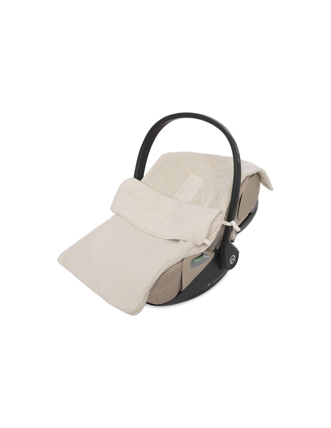 Son extérieur en coton tricoté point mousse, couleur crème, offre un style doux et intemporel, tandis que l’intérieur en polaire duveteux garde bébé bien au chaud lors des balades hivernales.