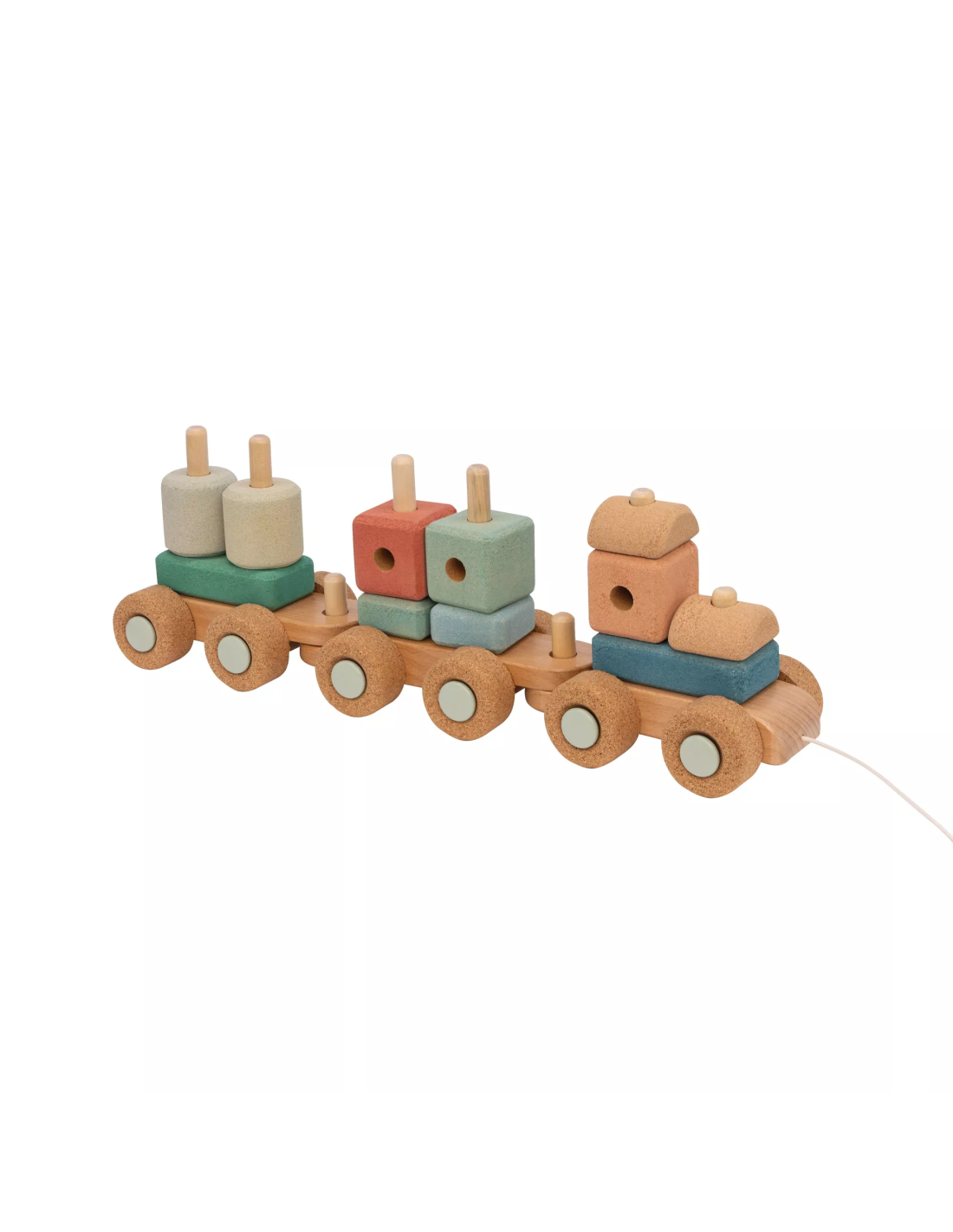 L’enfant peut assembler les éléments, empiler des blocs en liège de deux formes différentes, et même tracter le train grâce à un cordon. Les couleurs sont intégrées directement dans le liège, apportant des teintes naturelles et subtiles. Ce jouet stimule la coordination main-œil, la motricité fine et l’imagination, en faisant un compagnon idéal dès les premiers pas dans le jeu de construction.