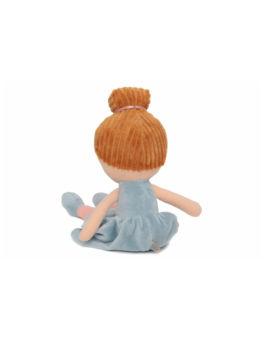 Super Peluche Danseuse Rose très douce au toucher, elle porte une jolie robe Bleue en velours, et est coiffée d'un Chignon