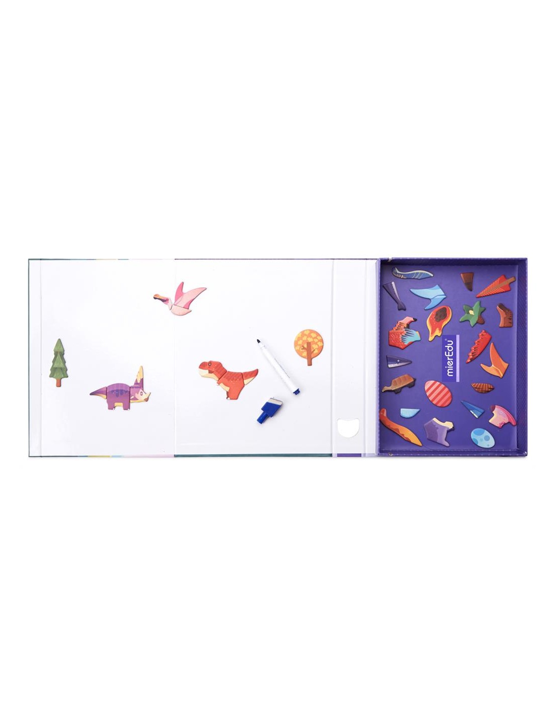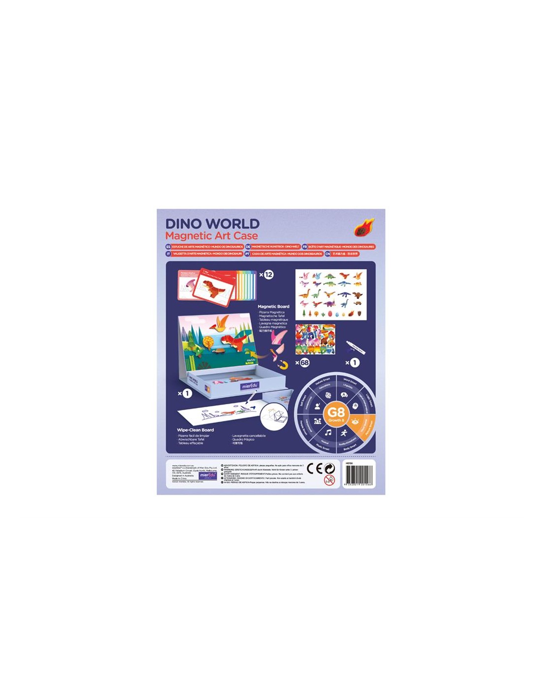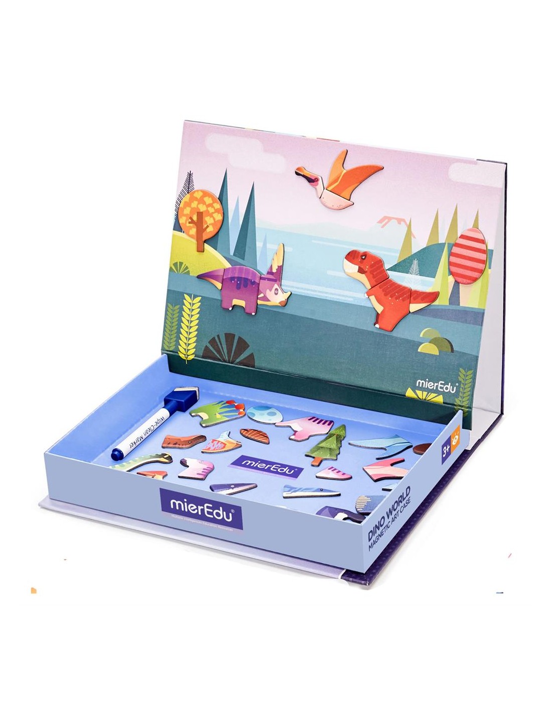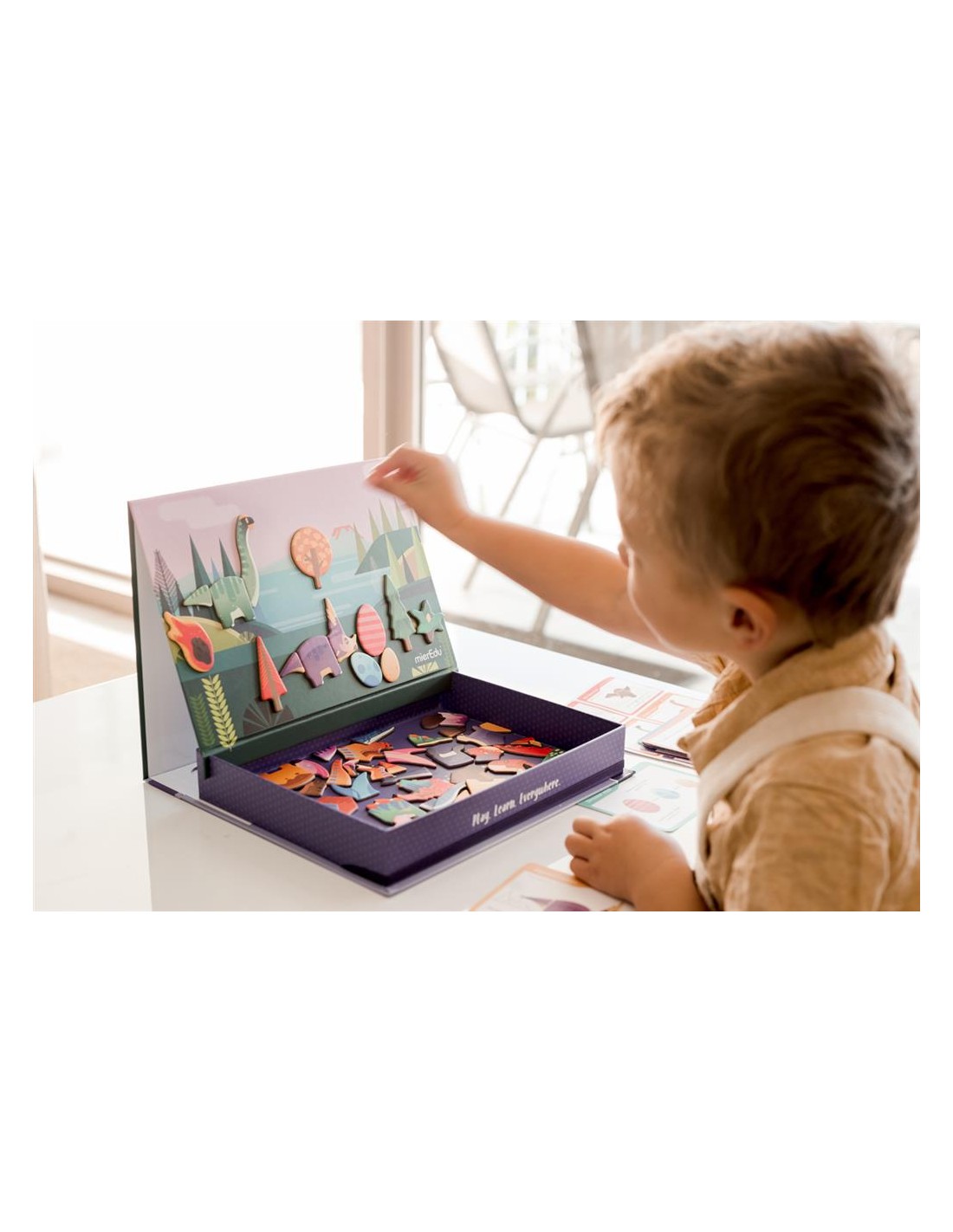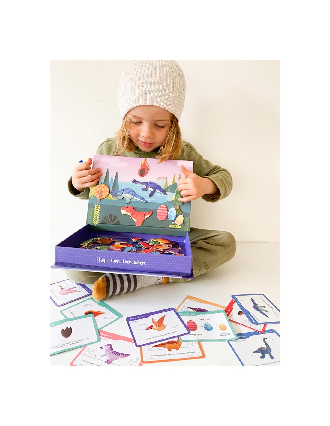 Super livre magnétique de 80 pièces, 12 cartes, 68 pièces magnétiques dinosaures et un marqueur effaçable présenté dans une mallette pratique et facile à emporter.