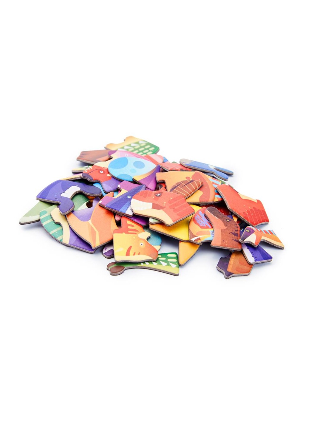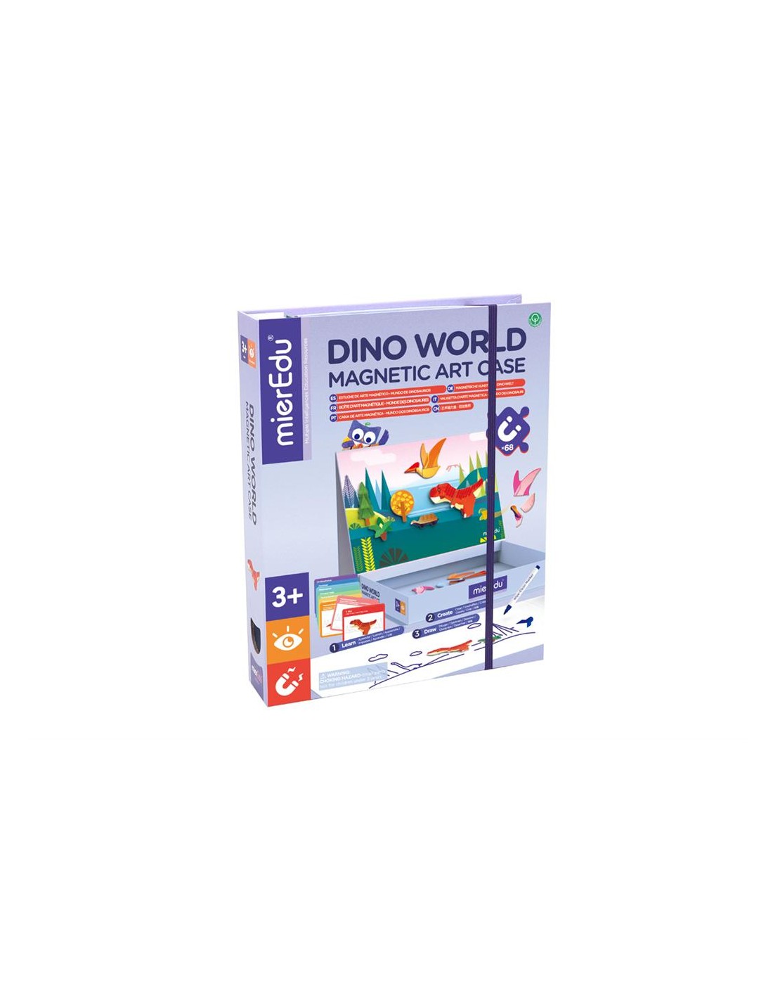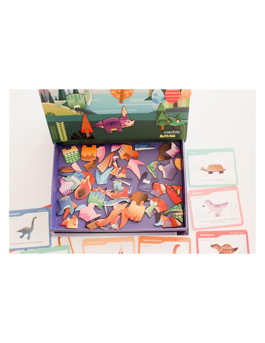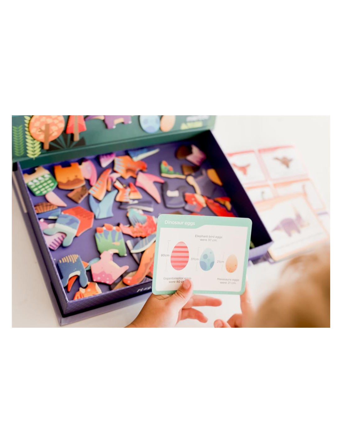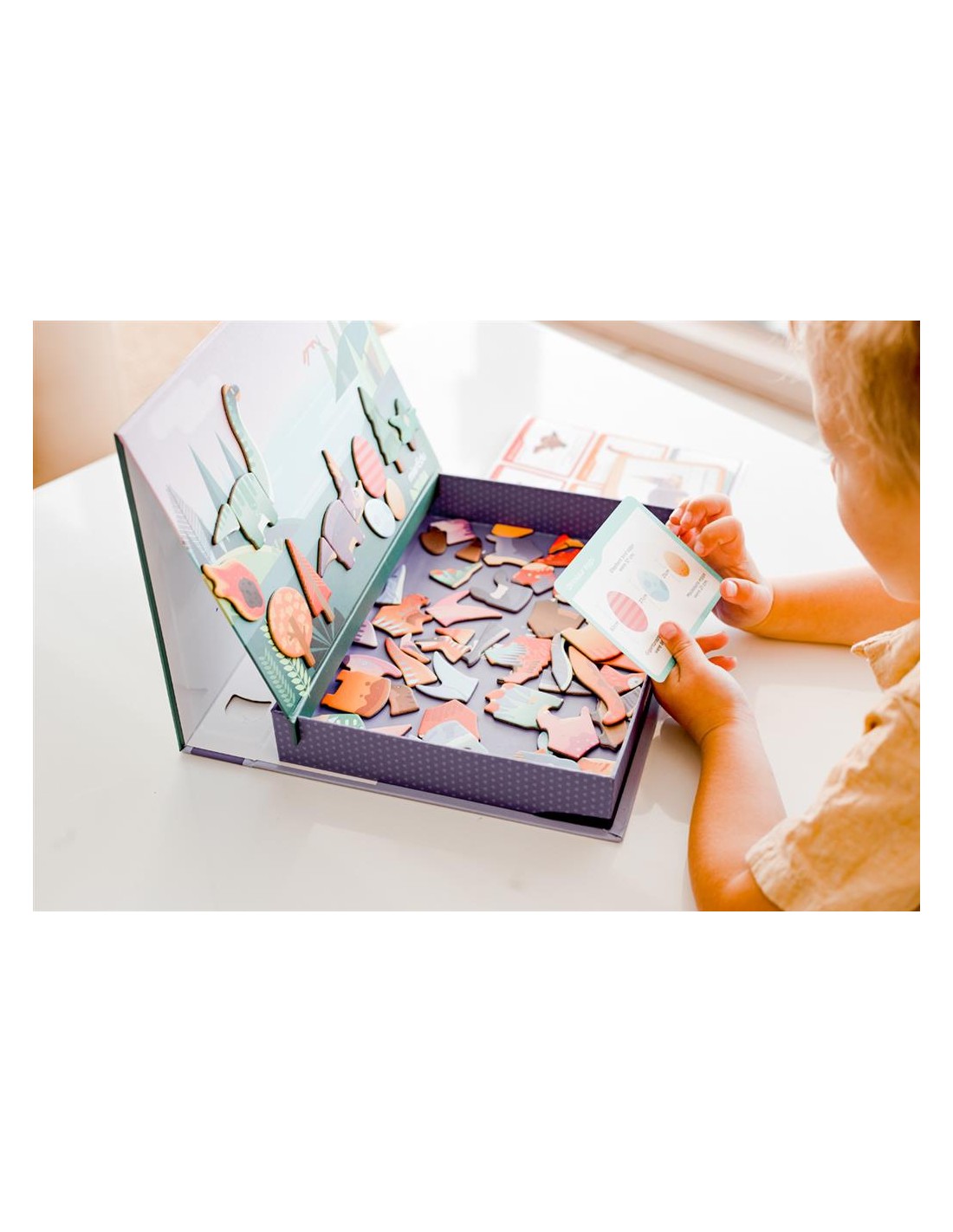 Super livre magnétique de 80 pièces, 12 cartes, 68 pièces magnétiques dinosaures et un marqueur effaçable présenté dans une mallette pratique et facile à emporter.