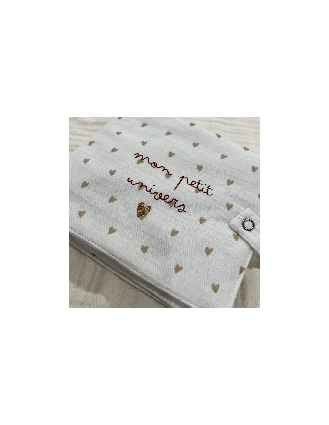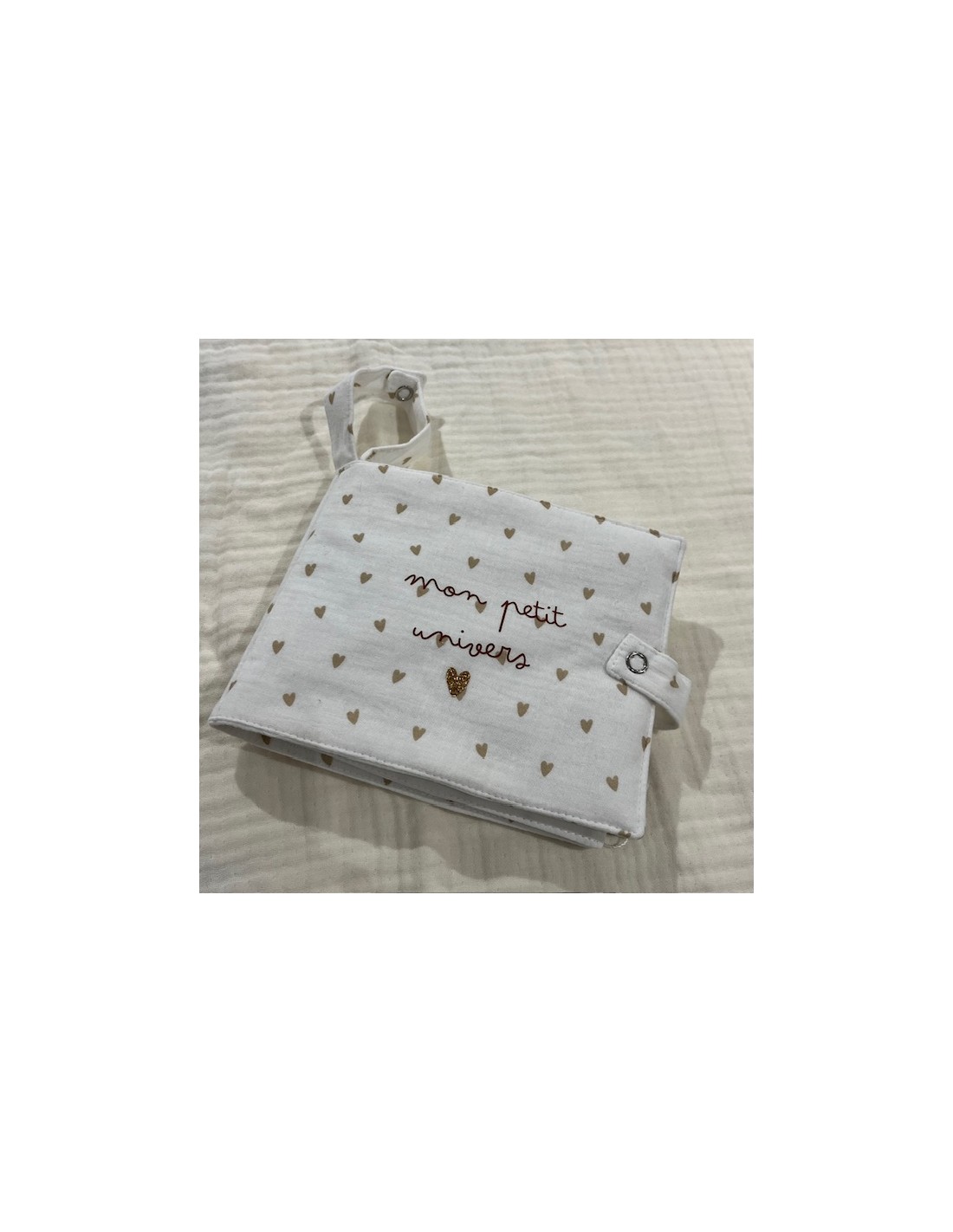Joli petit Album photo pour enfant en Gaze de coton Blanche imprimé Cœurs Beiges - mon petit univers - Cœur Glitter Doré