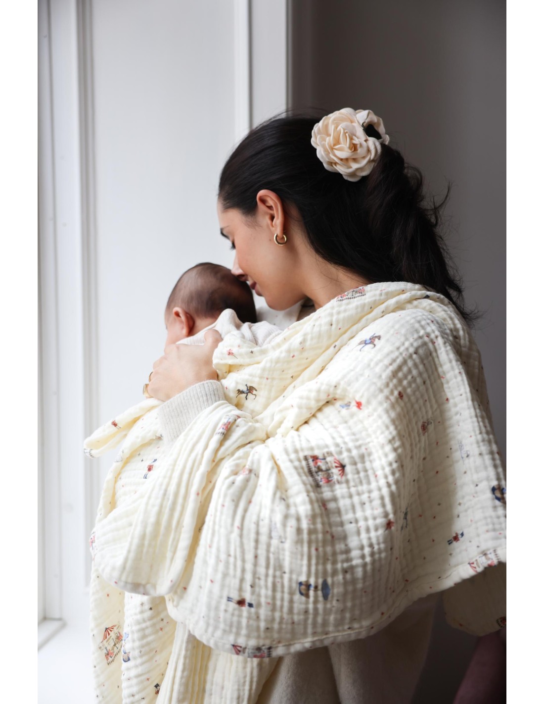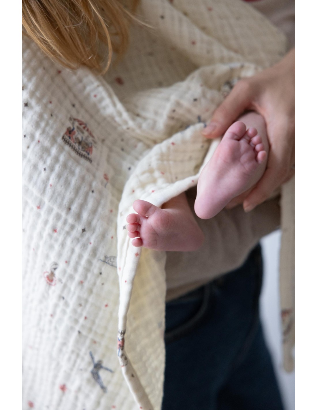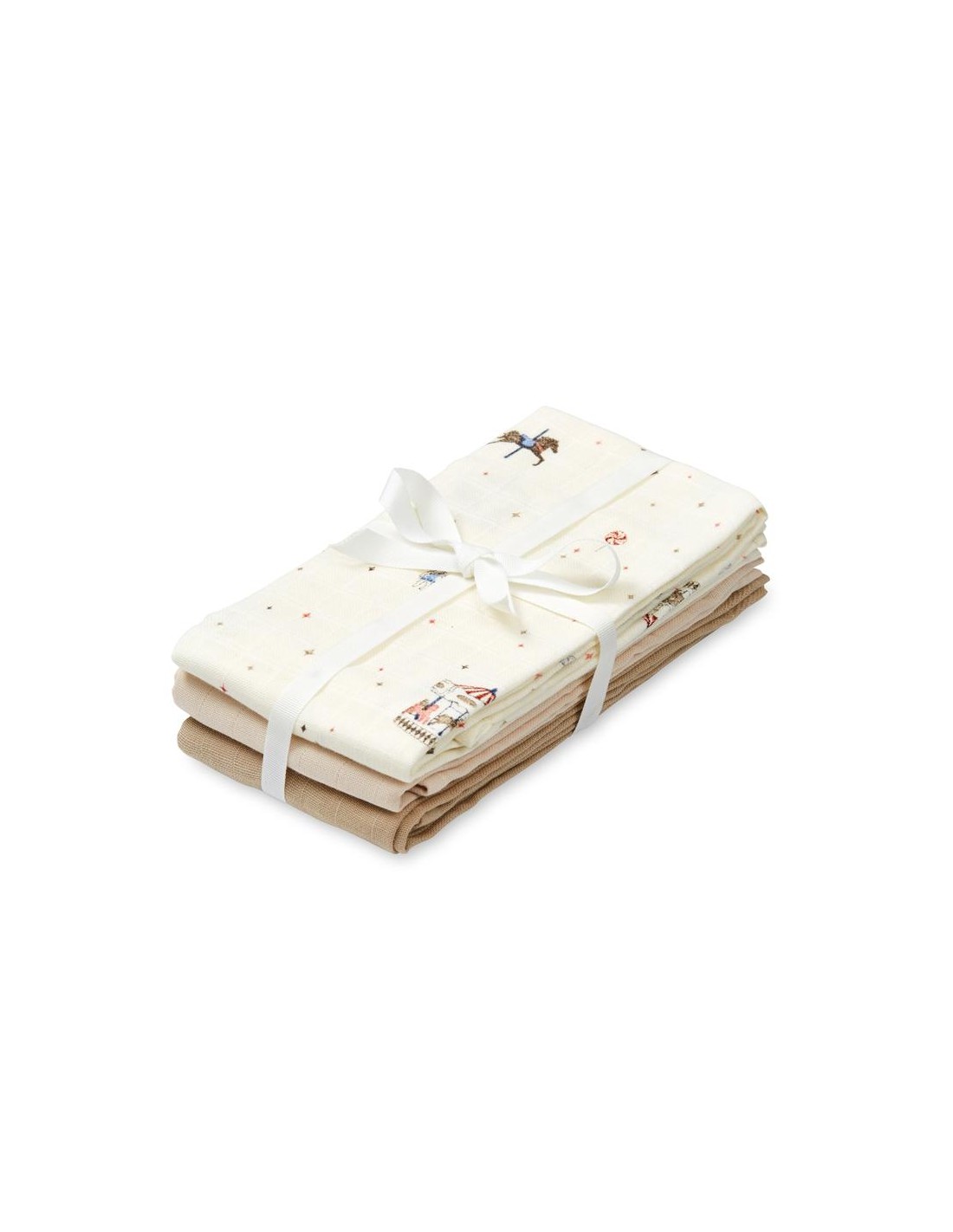 Ces trois jolis langes assortis Carousel, un beige Clair, un beige foncé, un imprimé Cirque sur fond écru en mousseline de coton biologique.