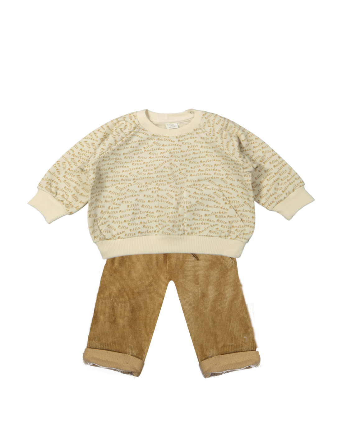 Il se compose d’un sweat crème en coton, doux et facile à assortir, et d’un pantalon en velours côtelé avec un lien de serrage à la taille pour un ajustement parfait.