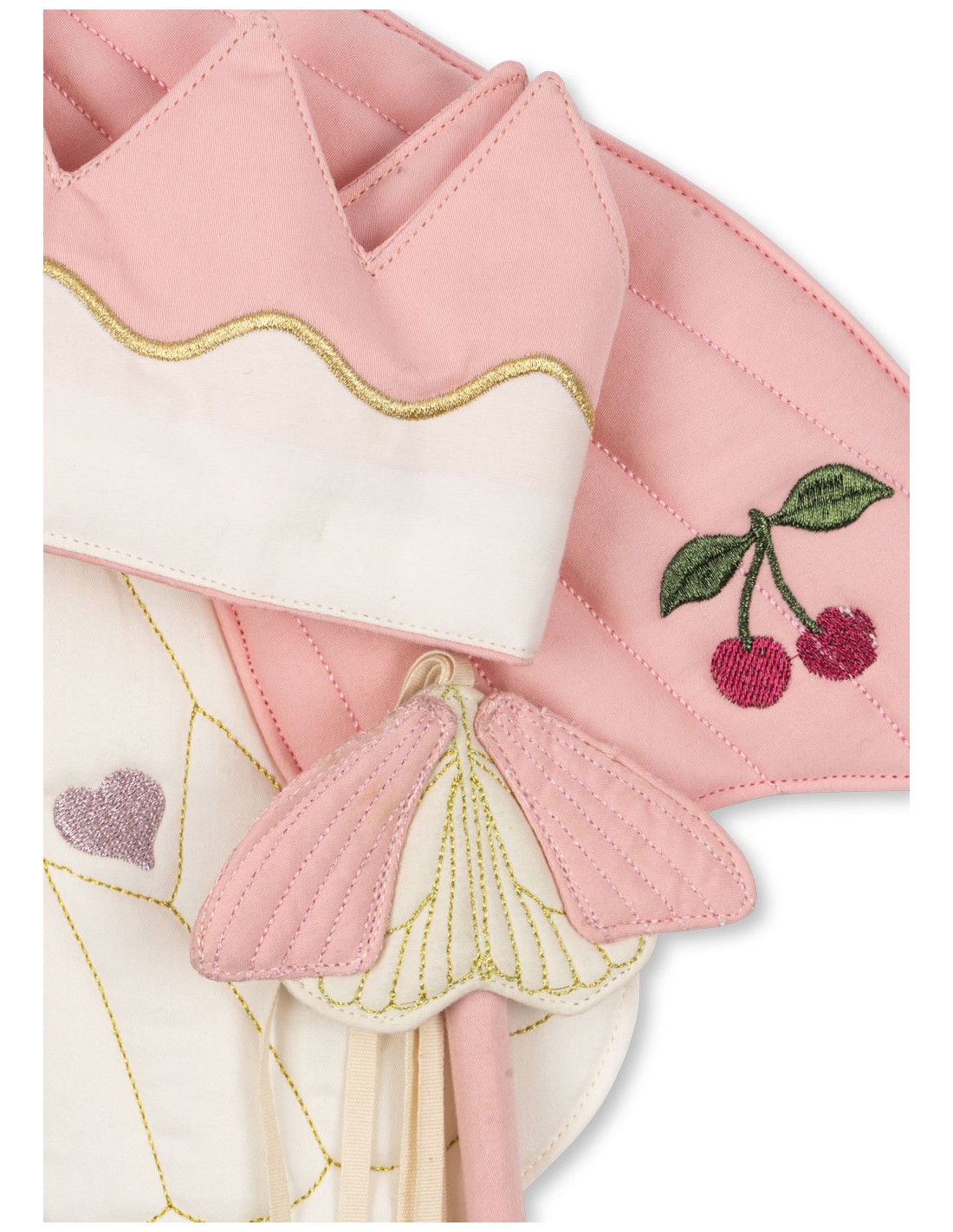 Conçu pour les enfants de 3 ans, cet ensemble enchanteur se compose de magnifiques ailes ajustables brodées de cerises et de petits cœurs, d’une baguette magique scintillante et d’une couronne en tissu délicat.