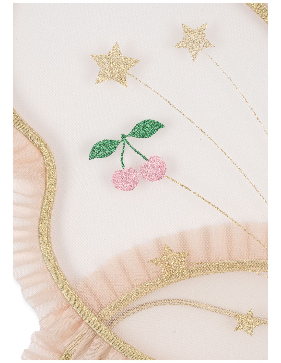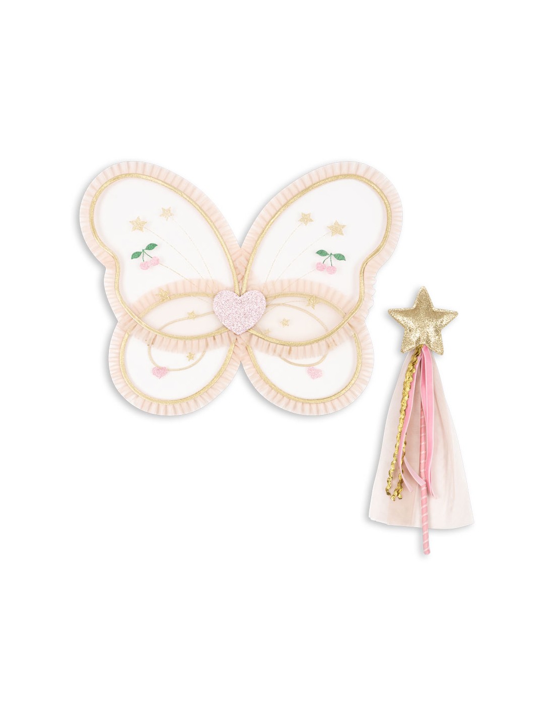 Conçu pour les enfants de 3 ans, cet ensemble enchanteur se compose de magnifiques ailes ajustables brodées de cerises et de petites étoiles, d’une baguette magique scintillante et d’une couronne en tissu délicat.