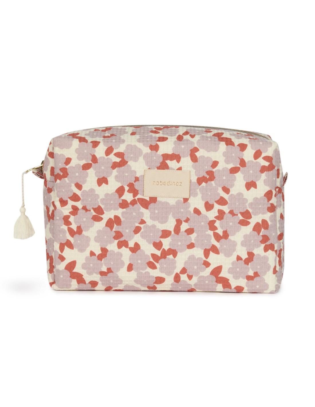 Magnifique trousse de toilette de couleur Mauve imprimé fleuri Sakura, avec son élégant pompon.