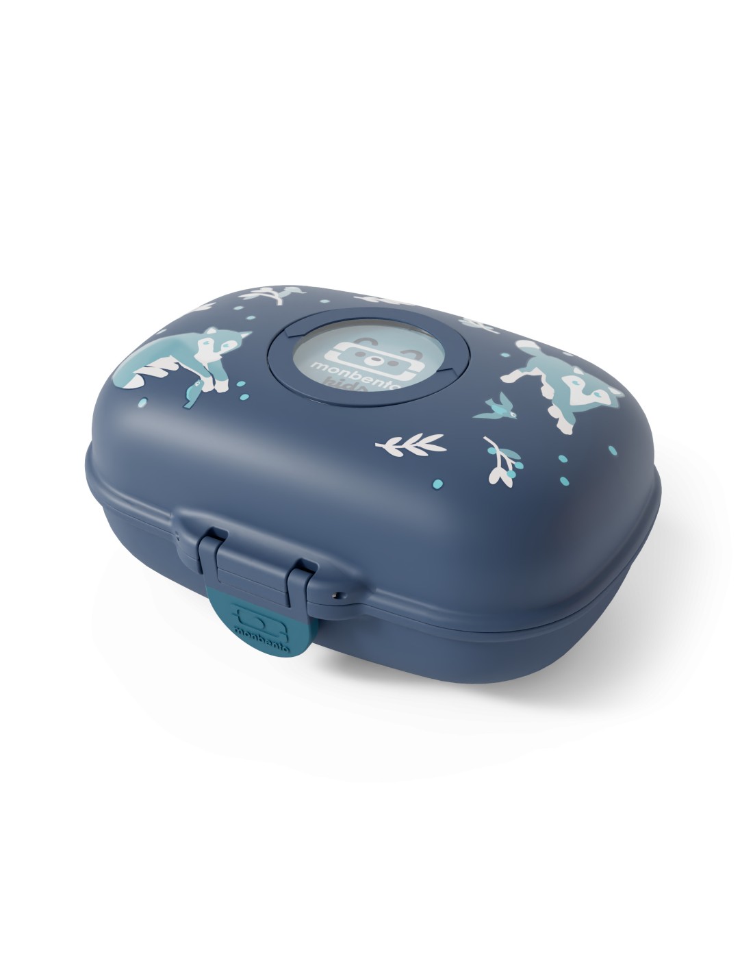 un seule grand compartiment, Personnalisable grâce à ses 4 pastilles interchangeable, aucun risque de confondre son goûter !